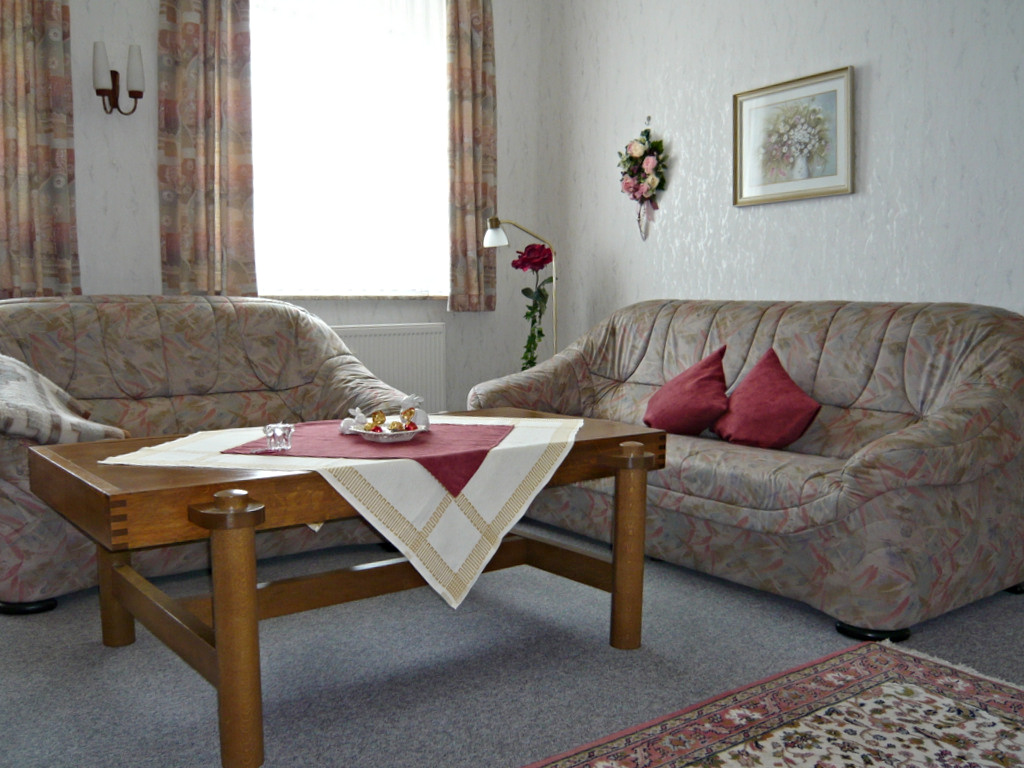 Im renovierten Haupthaus befindet sich im 1. Stock die Vier-Sterne-“Familien”-Ferienwohnung mit zwei Schlafzimmern. Das Wohnzimmer ist mit Farb-TV und großer Sitzecke ausgestattet, die Schlafzimmer mit Doppelbetten. Bettwäsche brauchen Sie nicht mitzubringen, die bekommen Sie natürlich von uns.